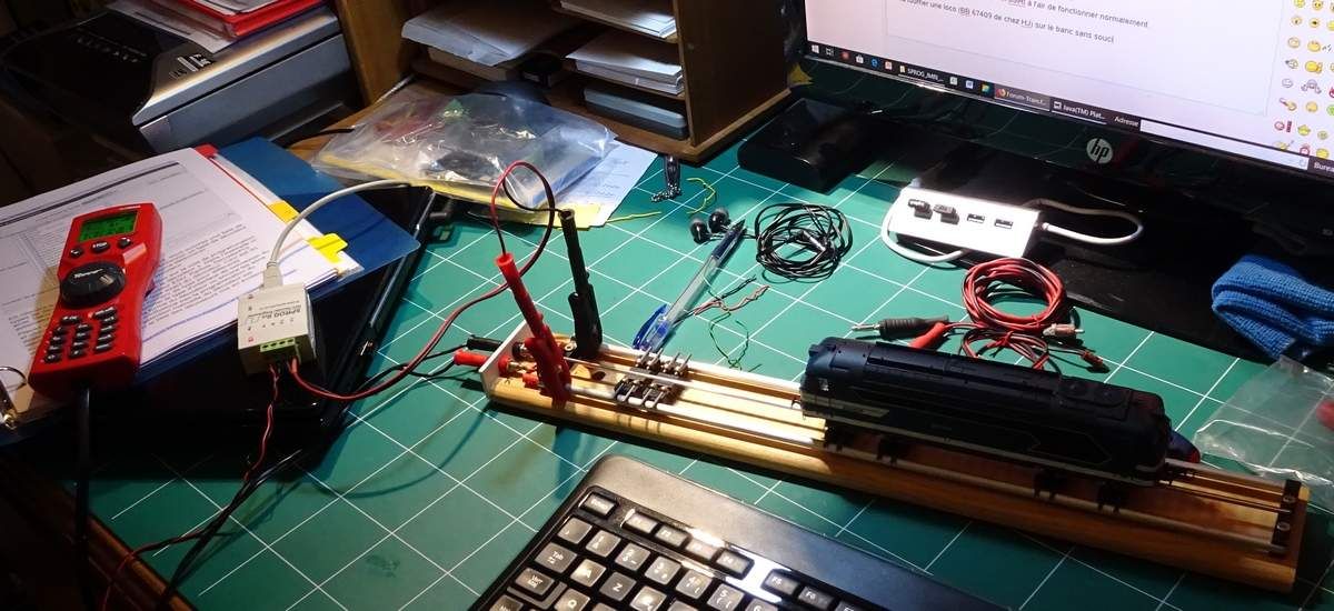 Ainsi avec mon PC, une voie de programmation, un petit banc d’essai et le boitier SPROG, j’ai équipé ma voie et le banc de fiches bananes femelles afin de pouvoir zapper de l’un à l’autre. mais on pourrait très bien améliorer ceci avec un système avec  inverseur.