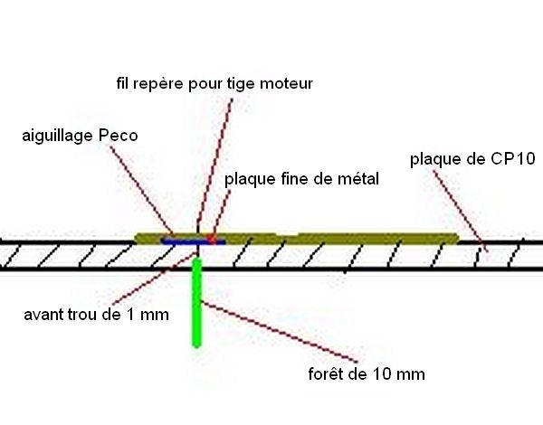 NB si jamais vous devez percer le trou de 10mm sans pouvoir enlever l’aiguillage, vous pouvez glisser un petit morceau de tôle sous l’aiguillage, mais ATTENTION c’est une opération délicate surtout quand le forêt débouche ! et ensuite bien nettoyer avec un aspirateur.