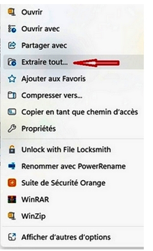 Pour le de zipper avec Win 11 il suffit de faire un clic droit et dans le menu déroulant clic gauche sur Extraire tout